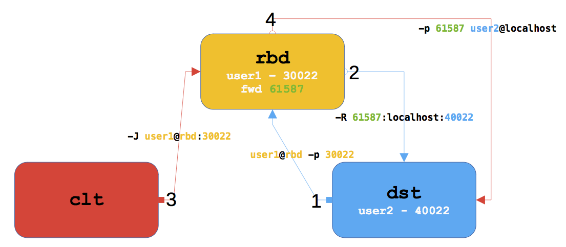 dst $ ssh -N -R 61587:localhost:40022 user1@rbd -p 30022 &